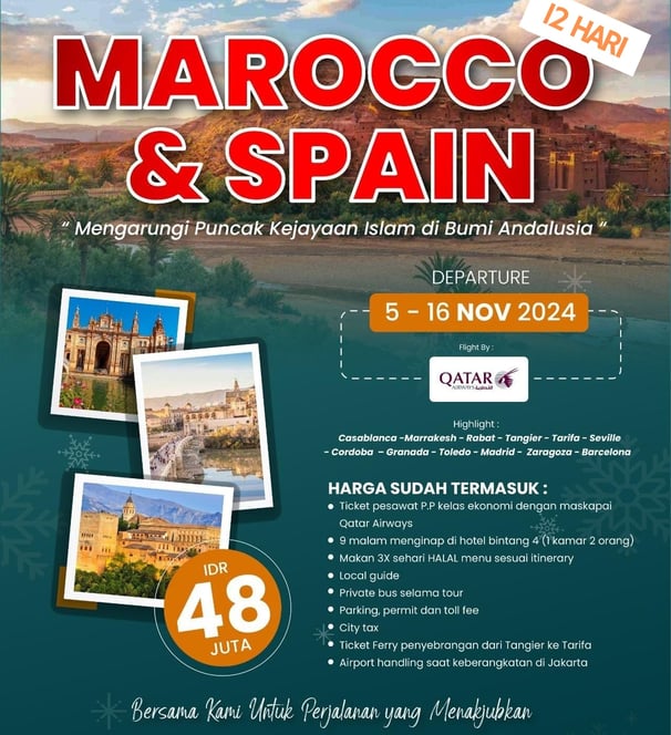 Jelajahi Maroko dan Spanyol, mulai dari Marrakech dan Casablanca hingga Tangier. Lanjutkan ke Spanyol, mengunjungi Seville, Cordoba, Granada, dan Barcelona. Nikmati arsitektur megah dan sejarah Islam yang memukau di setiap kota.